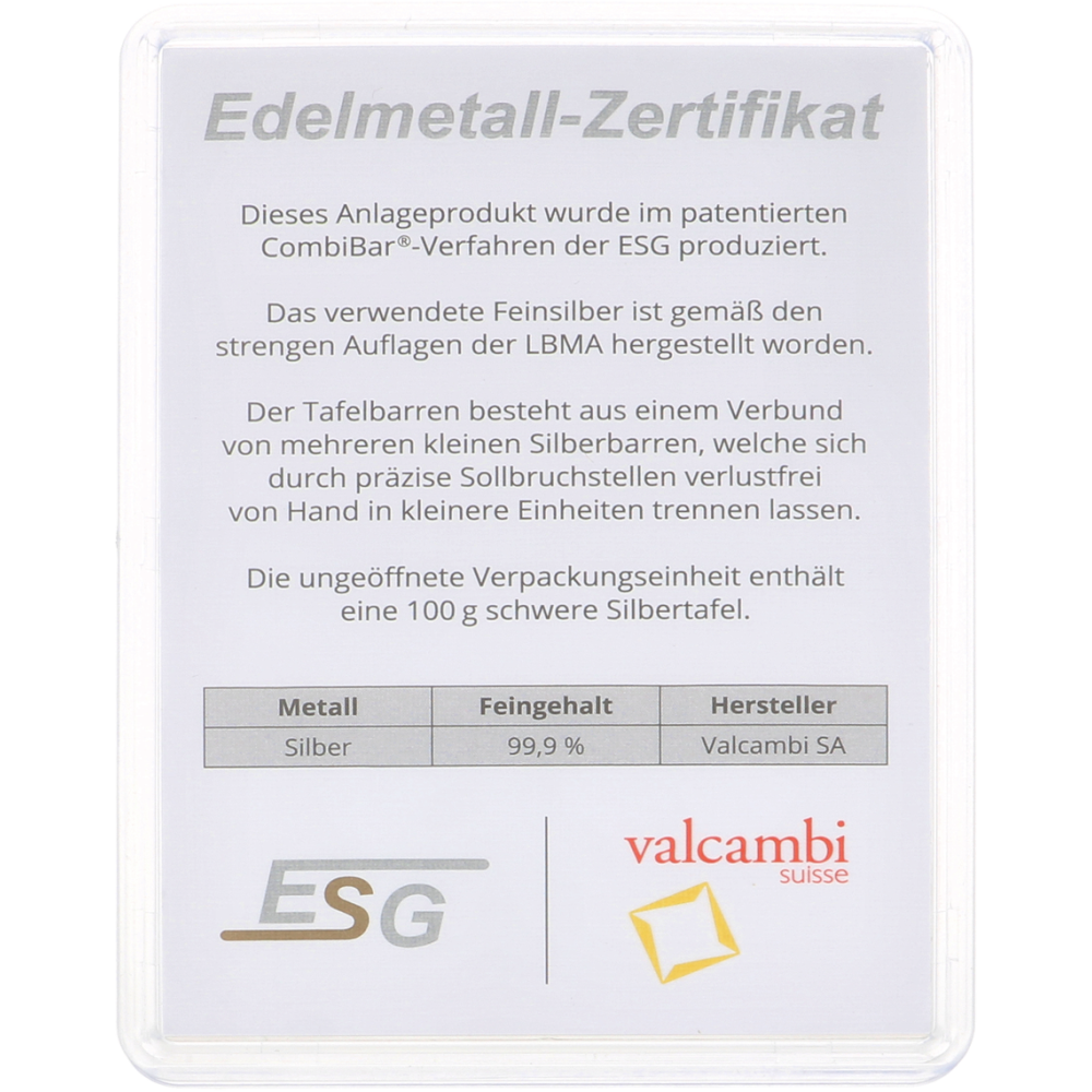 Der Vorteil beim Kauf der CombiBar mit 10 Goldbarren à 10 Gramm besteht darin, dass man sein physisches Silber teilweise verkaufen kann. Einen Silberbarren von 100 Gramm kann man hingegen nur als Ganzes verkaufen. Ein Teil davon zu verkaufen, ist nicht möglich. Mit dem Valcambi CombiBar bestimmen Sie selbst, wie viel Gramm Silber Sie verkaufen. Der CombiBar ist so hergestellt, dass die Silberbarren eine stabile Einheit bilden. Die Silberbarren lassen sich leicht voneinander trennen, ohne dass dabei Silber verloren geht. Wenn Sie investieren möchten, ist Silber eine sichere Wahl. Das liegt daran, dass Edelmetalle in Zeiten von Inflation oder einer Wirtschaftskrise an Wert gewinnen. Dies sorgt dafür, dass Ihr Vermögen in Zeiten einer Wirtschaftskrise geschützt bleibt, wenn Sie physische Edelmetalle besitzen. Wenn Sie Silberbarren von Goldwechselhaus erwerben, tätigen Sie also eine sichere Investition. Zudem sind die Silberbarren oft schnell lieferbar, sodass Sie kurzfristig Eigentümer von physischem Silber sind. Die von Goldwechselhaus gelieferten Silberbarren bestehen zu 99,9 % aus Silber. Diese werden von Hand gegossen und einzeln gewogen. So besteht keinerlei Zweifel an dem Gewicht und den Spezifikationen. Die Silberbarren, die Sie von Goldwechselhaus erwerben, sind also stets von hoher Qualität.
